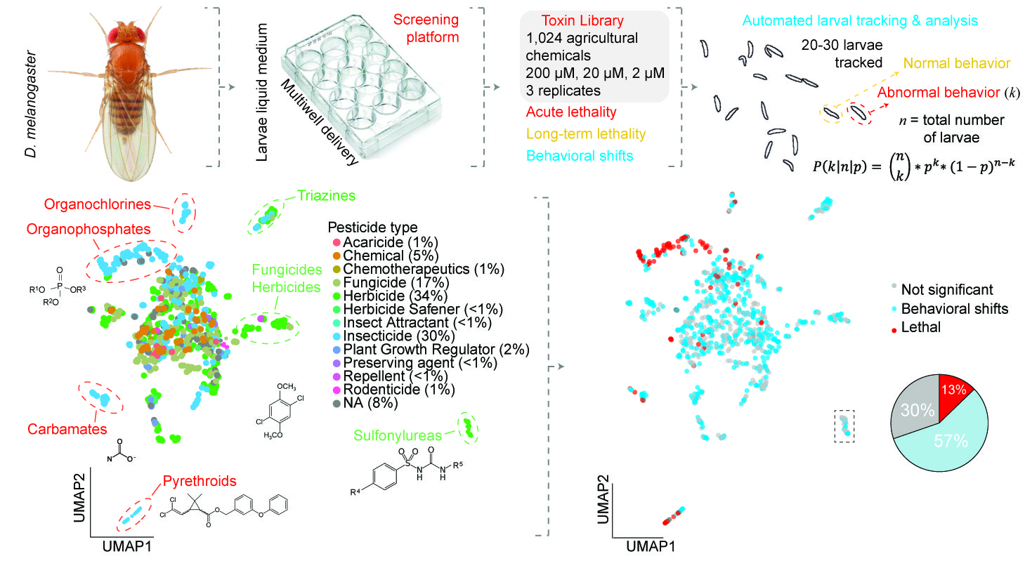 Worldwide, insect populations are declining at an alarming rate, and exposure to agrochemicals has been identified as a key factor affecting insect biodiversity and ecosystem health. Despite the prevalence of these chemicals, few studies have systematically evaluated their effects on insects at sublethal, environmentally relevant concentrations. In a previous work (Gandara et al. Science, 2024), we developed a high-throughput screening platform to evaluate the impact of 1024 different agrochemicals, including insecticides, herbicides, fungicides, and plant growth regulators, on the behavior of Drosophila melanogaster. Our results showed that 57% of the tested agrochemicals—many of them non-insecticide agrochemicals—significantly altered larval behavior at sublethal concentrations. Consistent with these results, we observed that exposure to these chemicals at doses orders of magnitude below lethality induced widespread phosphorylation changes across the larval proteome and changes in development and reproduction. Additionally, similar behavioral changes were detected across multiple insect species, including mosquitoes and butterflies. Thus, these results provide experimental evidence strongly suggesting that sublethal doses of agrochemicals contribute to the global decline in insect populations. Building on this approach, we now plan to use this chemical library to measure the functional phenotypic integration among the various defense systems necessary for successful xenobiotic detoxification. Understanding the underlying mechanisms of the systemic response to chemical stressors will provide essential information for predicting how molecules in the environment affect animal systems.